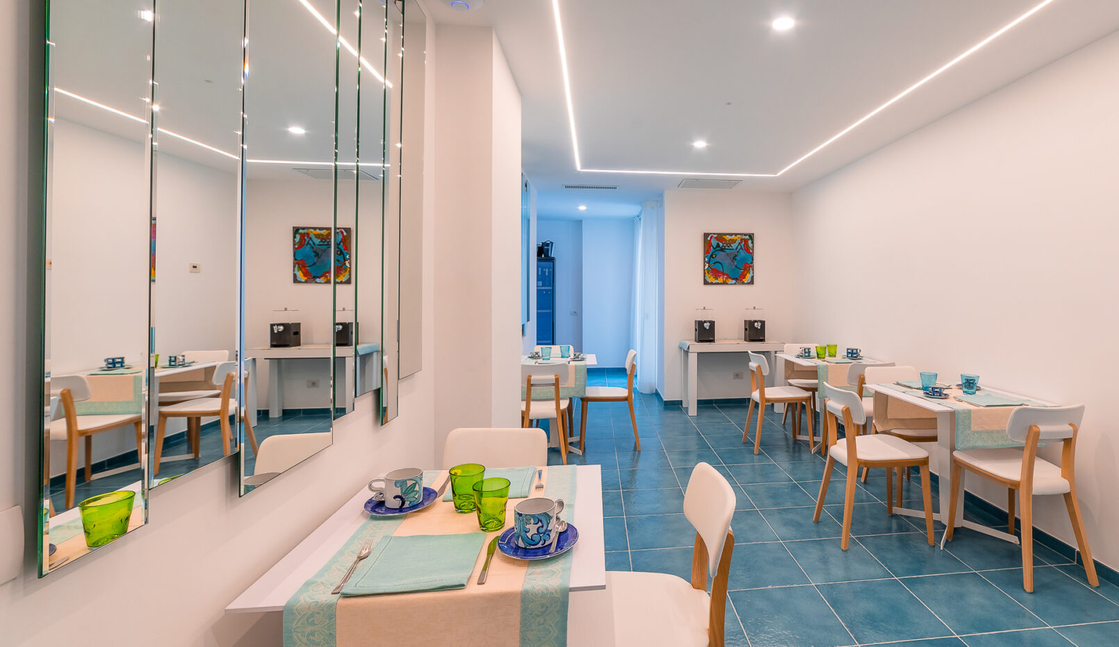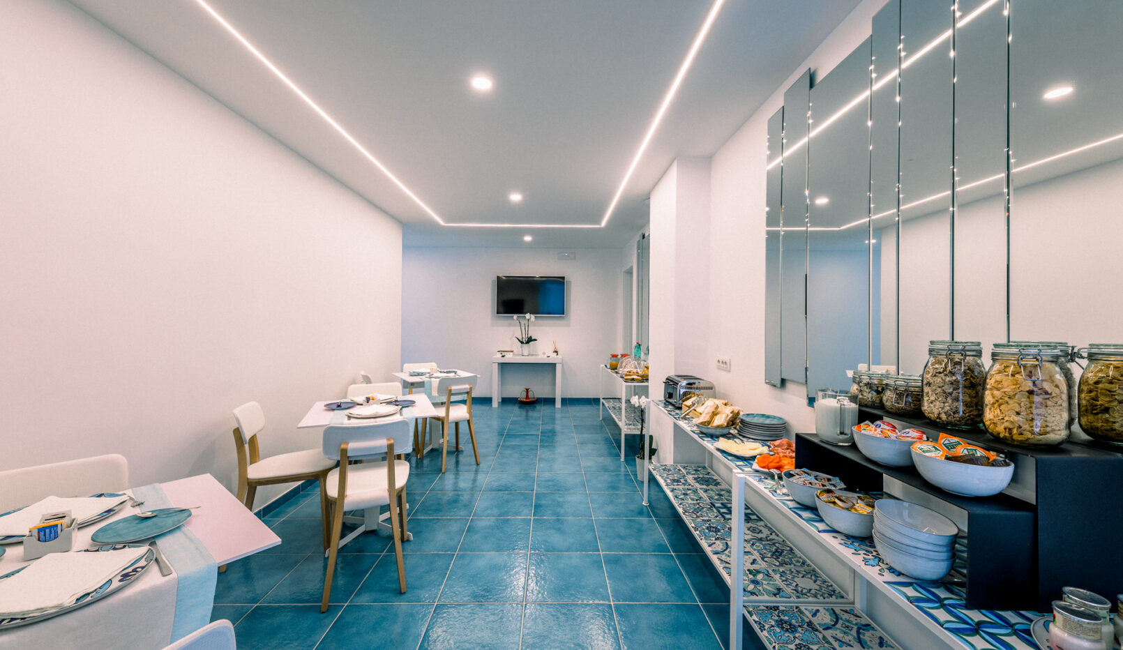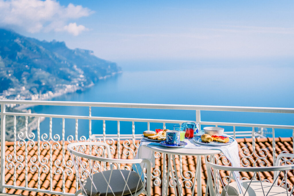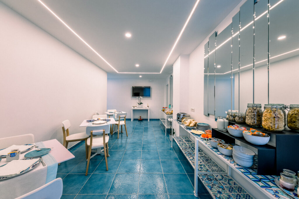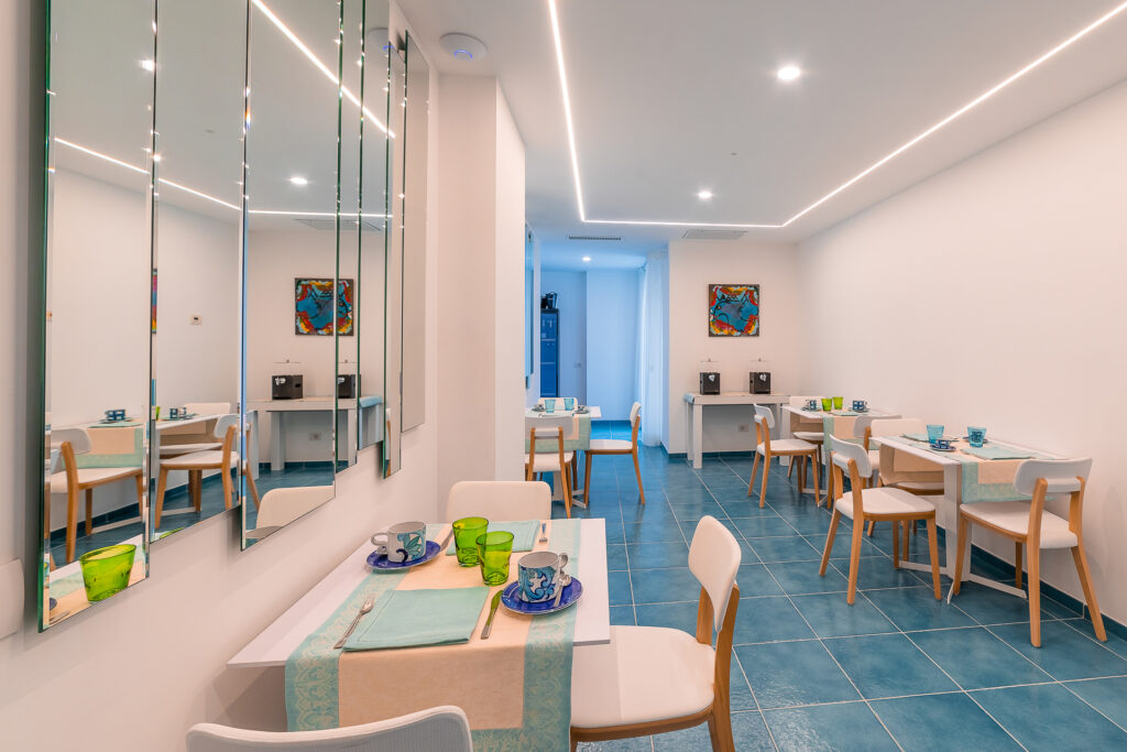 Al mattino, gli ospiti possono iniziare la giornata con una piacevole colazione vista mare, in un’atmosfera rilassante e suggestiva.