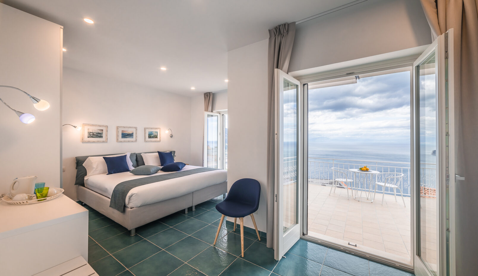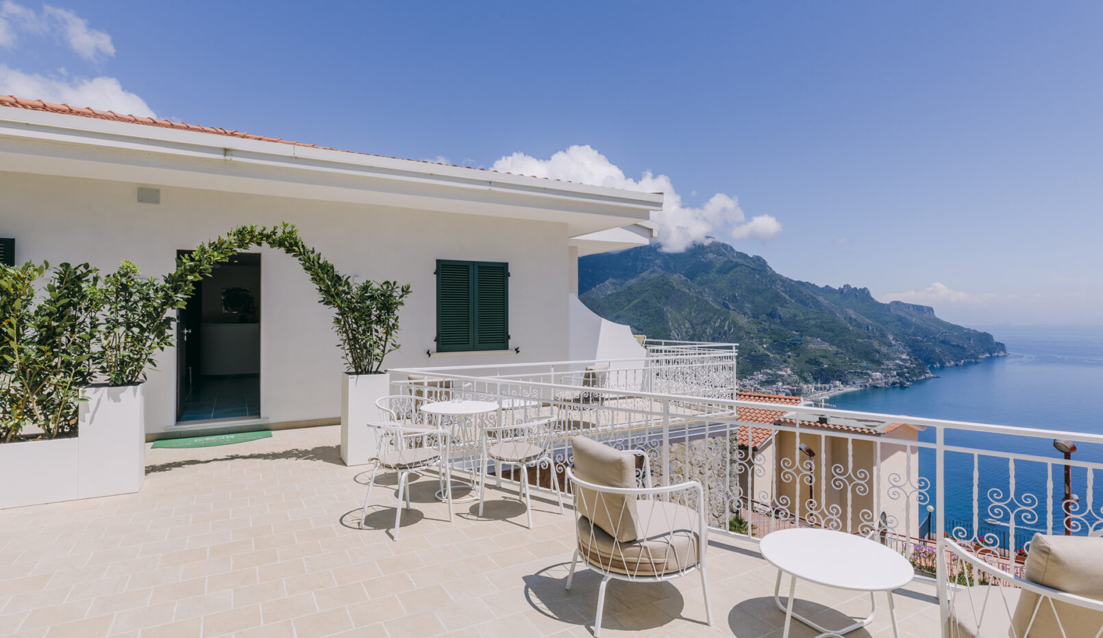 Alcune camere dispongono di terrazze private con vista mare, attrezzate con tavoli, sedie e area solarium, ideali per momenti di relax.