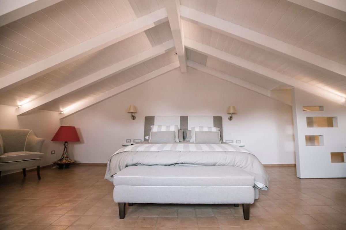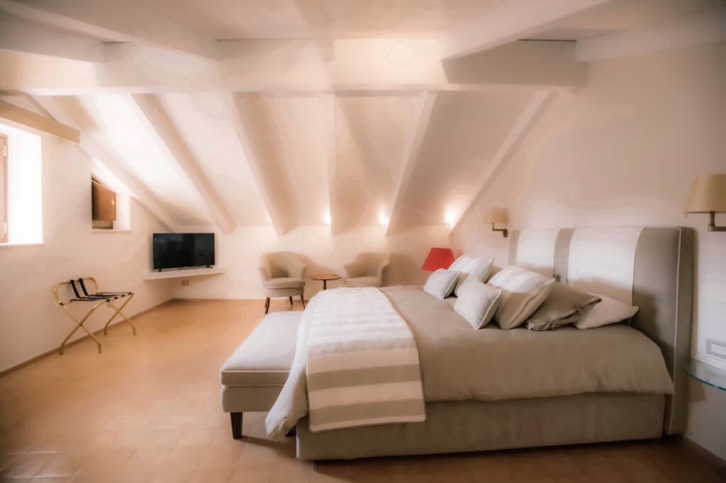 Situata al piano superiore, la suite si affaccia direttamente sulla piazza principale, offrendo una vista suggestiva e un’atmosfera autentica.